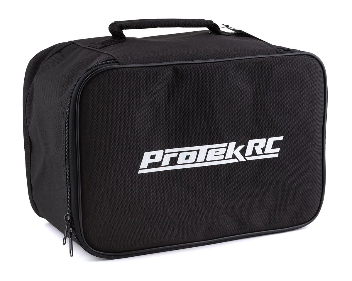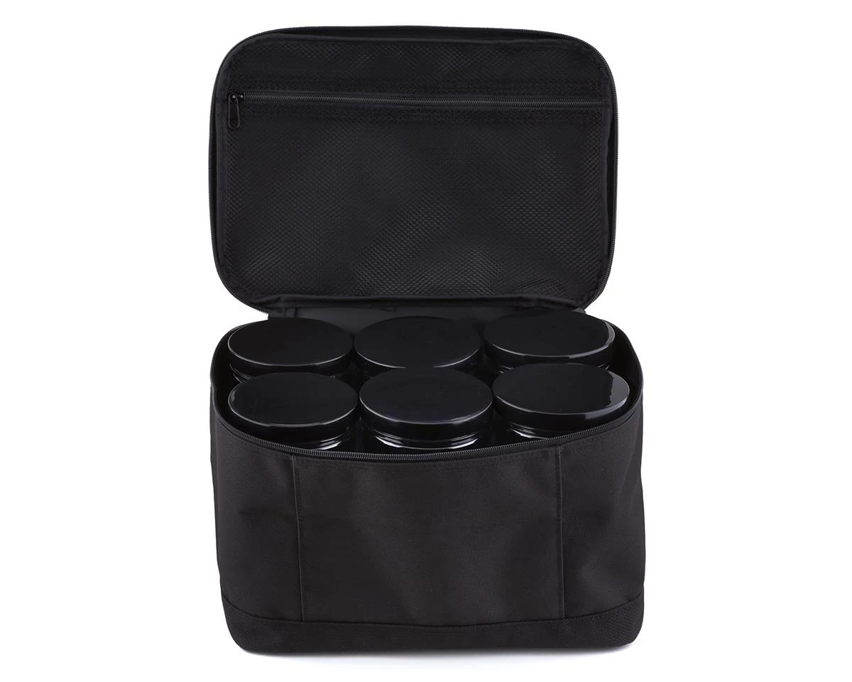 The ProTek RC 1/10 Buggy Tire Bag is a convenient way to haul and preserve your tires, as well as anything else that fits inside one of six included, airtight 6.5″ tall, 3.5″ diameter screw on lid storage tubes. The bag itself is made from heavy duty nylon material and measures 12.75″ wide, 8.25″deep and 7.5″ tall. The lid of the bag features a large ProTek RC logo in white, and has a 12×7.5″ mesh zippered pocket on the inside providing a place to stash setup sheets, tools or other small accessories that may come in handy at the track. If you are serious about keeping your gear neat and tidy, this bag is a must have accessory.