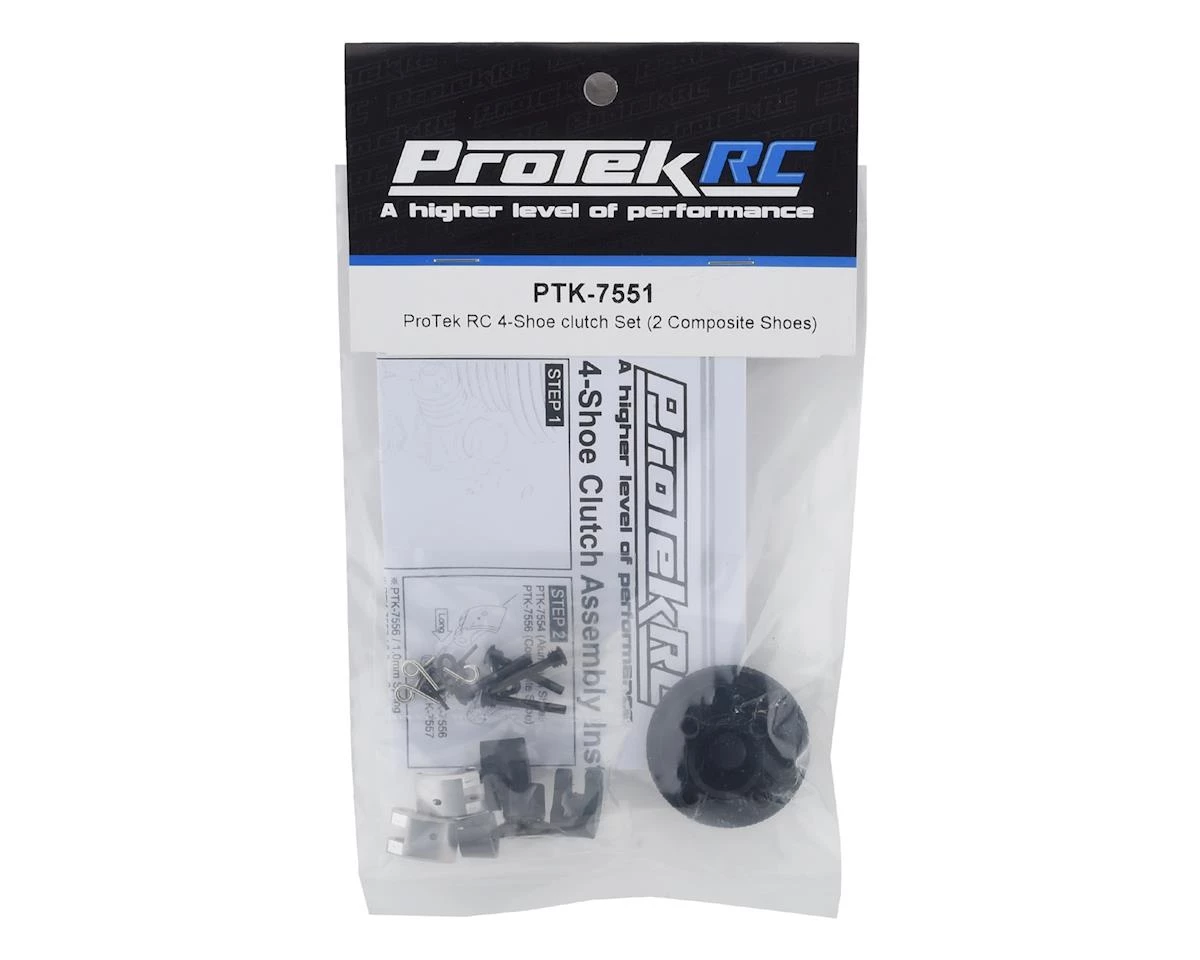 The ProTek RCÂ 4-Shoe Off-Road Clutch Set was developed in collaboration with ProTek team drivers, for discriminating 1/8 scale racers. This premium level clutch features a 34mm aluminum 4 shoe flywheel with removable steel pins so you can replace them when needed. A complete set of four 1.0, and four 0.9 springs are included, so you can mix and match spring rates as needed to tune the engagement to suit your engine, track conditions and personal preferences.