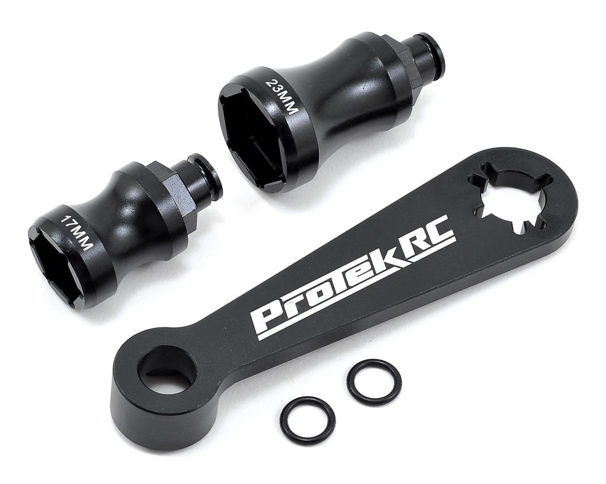 This billet aluminum wrench features a combination 17mm hex/flywheel wrench, with two interchangeable 17mm and 23mm socket pieces. The wrench by itself is perfect for removing the wheel nuts on 0 offset 1/8 buggy and truggy wheels, while the flywheel wrench on the opposite side can be used with both 3 pin and 4 pin flywheels. The long 17mm socket is perfect for 1/8 truggys and monster trucks that use 1/2 offset wheels with 17mm hexes, while the 23mm socket is ideal for 23mm hex monster truck wheels and 23mm 1/5 scale wheels!