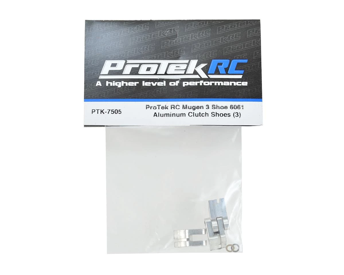 This is a set of three ProTek R/C Mugen 6061 Aluminum Clutch Shoes. ProTek R/C clutch shoes are designed to work with the stock flywheel to provide increased performance over the standard clutch shoe material. These shoes are precision machined from 6061 billet grade aluminum to provide a clutch shoe that is stable at high temperatures, offers consistent wear and increased clutch performance. ProTek R/C clutch shoes are an excellent option for high horsepower engines and harsh driving conditions, when the stock factory clutch shoes are not up to the task.